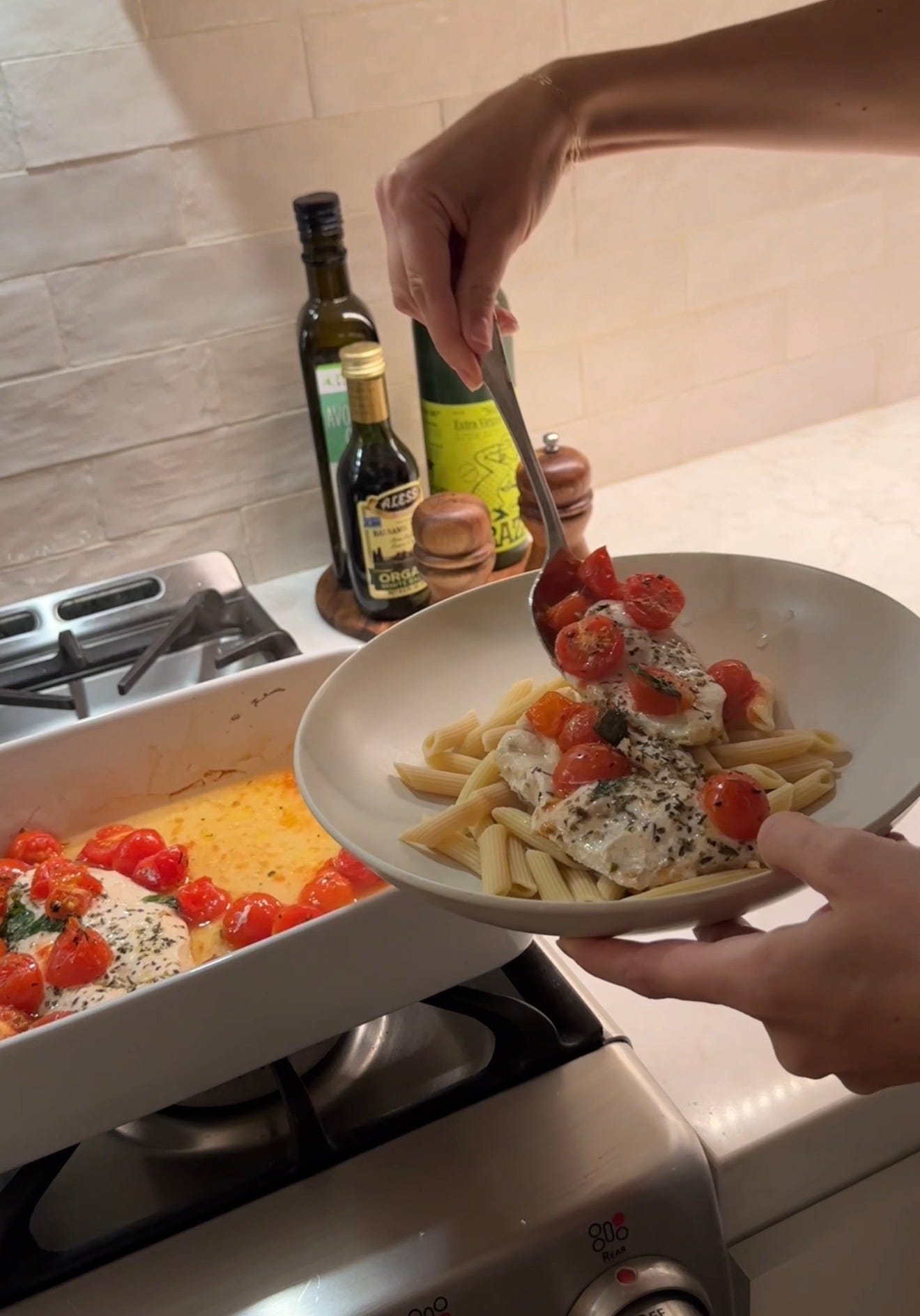 Combine pasta with the baked chicken and tomatoes. Add parmesan if desired.